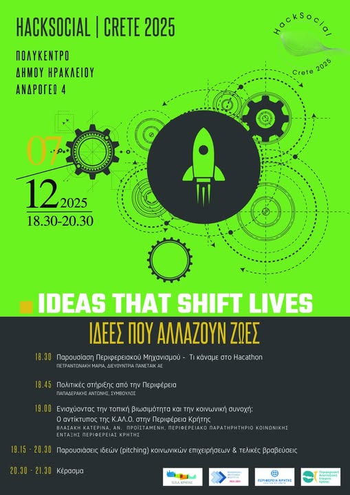 Η Περιφέρεια Κρήτης και η Π.ΑΝ.ΕΤΑΙ.Κ. Α.Ε. απευθύνουν ανοιχτή πρόσκληση στο κοινό για να παρακολουθήσει την τελική εκδήλωση του HackSocial Crete 2025, αφιερωμένη στην κοινωνική επιχειρηματικότητα και στην κοινωνική καινοτομία του νησιού.